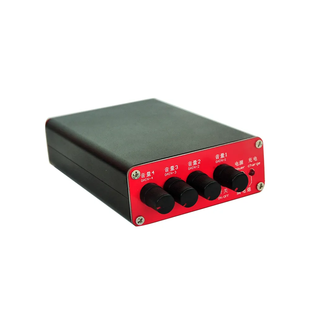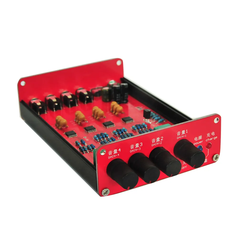 This is a DIY 4‑channel headphone amplifier designed independently, featuring a built‑in rechargeable lithium battery and four professional headphone amplifier chips from Chipstar. Each channel provides 130mW of drive power for 160‑ohm headphones (i.e., 260mW per stereo pair).